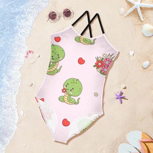 Girls One Piece Swimsuits Cute Snake with Flowers on Pink Sport Halter Swimwear Beach Bathing Suit,7-8T 1