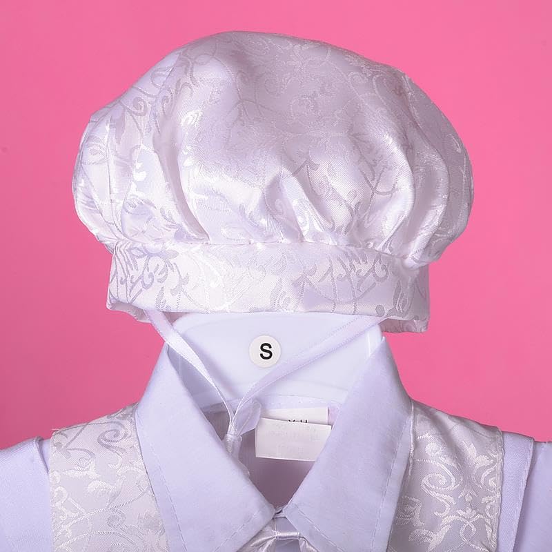 • 【Gentleman Suit Baptism Outfit】Dress shirt with neat pointed collar and detachable bowtie. Sliver filigree waistcoat with 3 button closure and a pair of faux pockets on each side. Pleated trousers with suspender cross straps and half elasticated waist. Comes with a jacquard bonnet with elastic band to ensure a perfect fit.