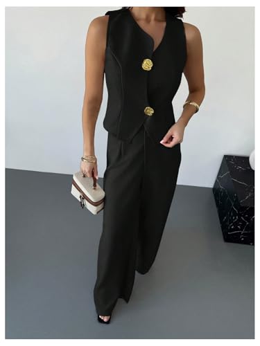 WDIRARA Women's 2 Piece Outfits Button Blazer Vest Wide Leg Pants Set Business Outfits 2