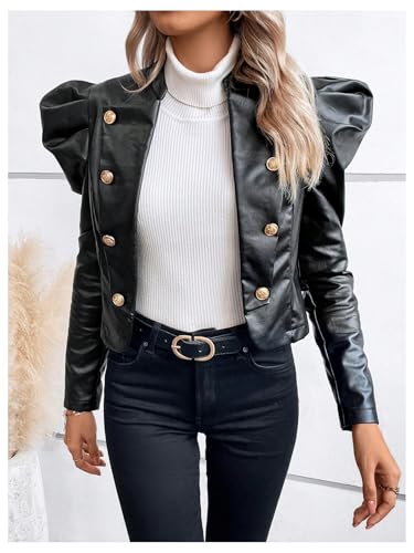 HOT ! MakeMeChic Women's Open Front Gigot Long Sleeve Leather Jacket Button Decor Blazer Jackets