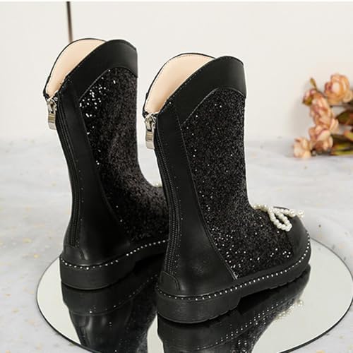 More information about Girls Glitter Mid-Calf Boots Pearl Bow knot PU Leather Waterproof Combat Shoes Fashion Sparkle Boot With Back Zipper