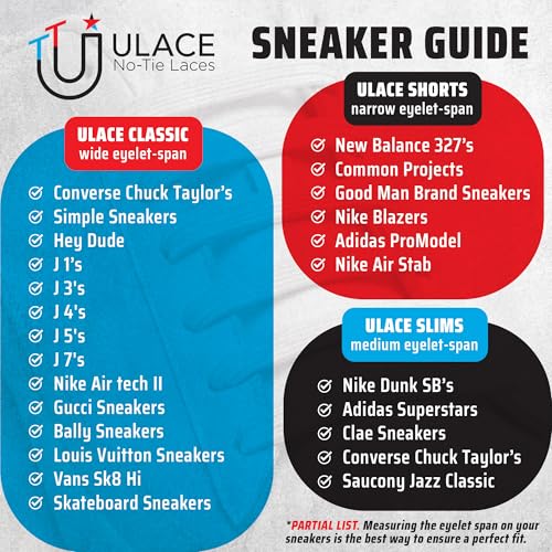 • Versatile for Every Generation: uLace caters to all ages with no-tie shoelaces for adults, teens, and children. With our 4 modular uLace sizes— Classics for sneakers with wide eyelet spans (2.25" to 4.25"), Slims for sneakers with medium eyelet spans (1.75" to 2.25"), Shorts for sneakers with narrow eyelet spans (1.25" to 1.75"), and Kiddos for Kids's sneakers with medium eyelet spans (1.75" to 2.25").