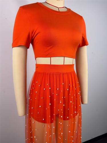 Women's Sexy 3 PCS T-shirts Tops Bodycon Shorts Mesh Pearls Skirts Cocktail Party Beach Outfits Set 2