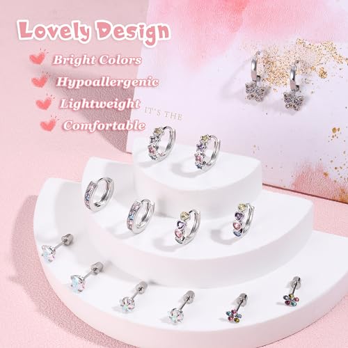 • Aretes Para Niñas: A set of 7 pairs affordable hypoallergenic earrings set: 4 pairs small hoop earrings and 3pairs cute screw back stud earrings. Including double love heart hoop earrings, daisy flower huggie hoops, butterfly dangle hoops,colorful star/heart hoop earrings and screwback earrings stud. Let your girl have the happiness of multiple choices at once