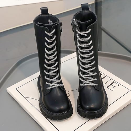 Girls Waterproof Side Zipper Mid Calf Combat Boots Trendy Faux Leather Outdoor Riding Boots Lace Up Winter Snow Boot 6