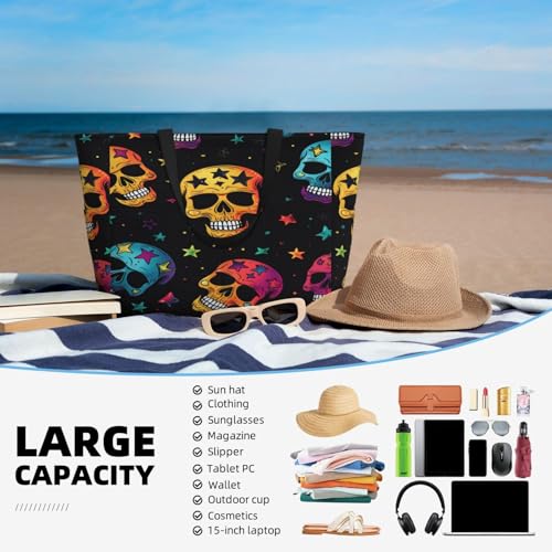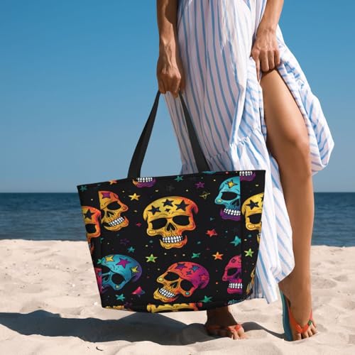 HOT ! Colorful Skull Beach Bags For Women, Skull Stars Large Waterproof Tote Bag Sandproof Pool Bag Handbag For Travel Work Gym